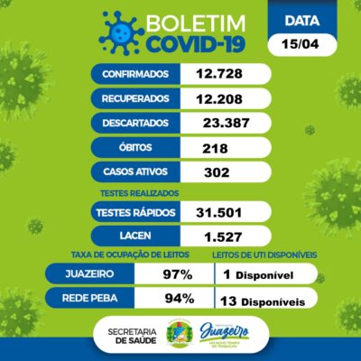 De acordo com o levantamento, 12.728 moradores foram infectados desde o início da pandemia na cidade, dos quais 12.208 já estão recuperados. Os casos descartados somam 23.387. Juazeiro tem 302 casos ativos do novo coronavírus.